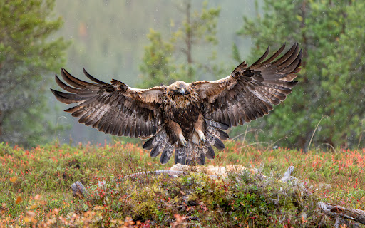 Usein maakotka laskeutuu edessä oleviin puihin ja sieltä ruokailemaan. Tällä kertaa kertaa kotkat tulivat 'salaa' joko kojun takaa tai edestä laaksosta. Kuvaajalla oli siten aikaa reagoida sekunti tai kaksi jos halusi ehtiä lentokuvaan. Onneksi kerran kotka laskutui myös edestä puusta joten kuvaajllakin oli mahdollisuuksia lentokuviin. Kokonaisuutena kotkat pyörivät paikalla useamman tunnin. Myös sadepäivä voi olla hyvä kotkakuvauspäivä!